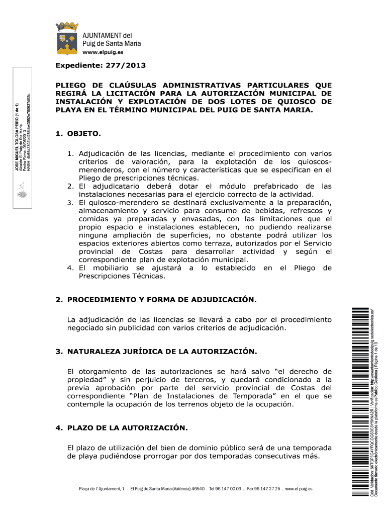 Obtener el gratis Expediente 2772013 PLIEGO DE CLASULAS ADMINISTRATIVAS - elpuig
