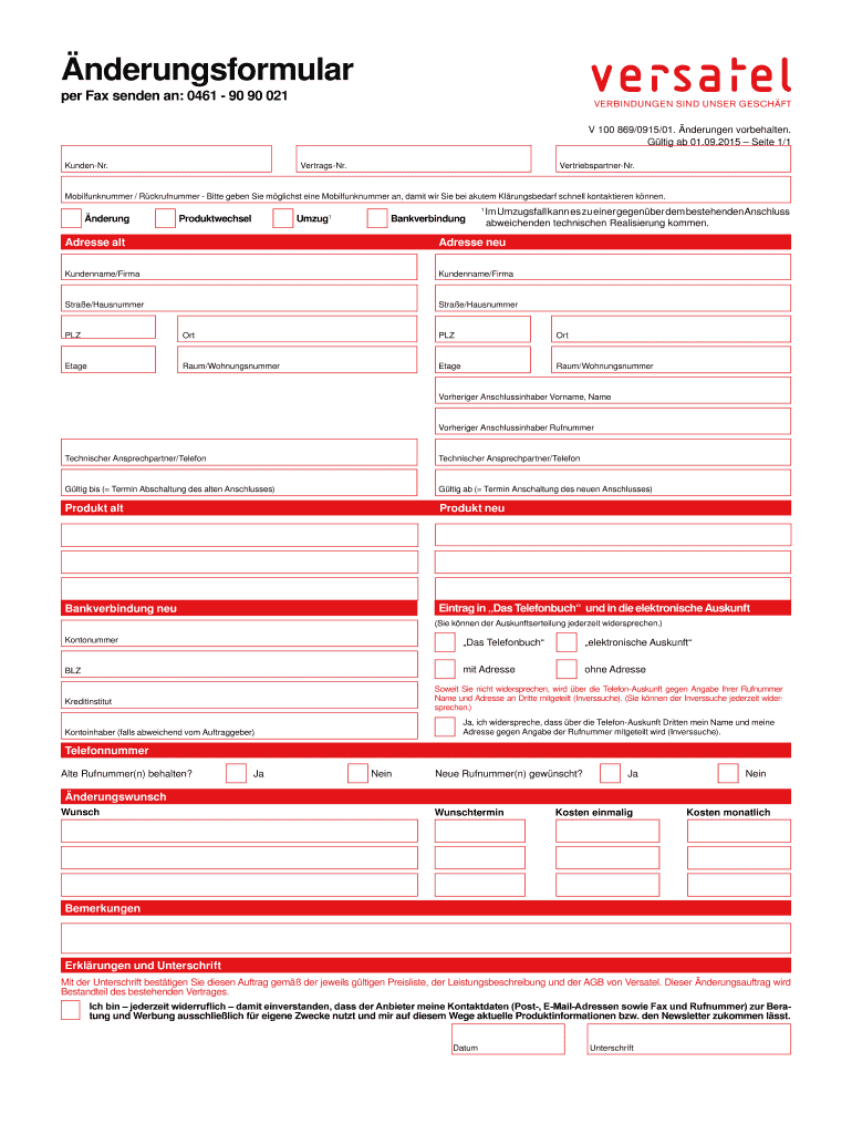 Nderungsformular per Fax sender an: 0461 90 90 021 V 100 869/0915/01. Drunken vorbehalten. Gig ab 01.09.2015 Sate 1/1 Under. VertragsNr. VertriebspartnerNr. Mobilfunknummer / Rckrufnummer Bitter Eben