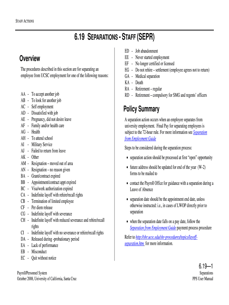 STAFF ACTIONS 6.19 SEPARATIONS STAFF (SEPT) Overview The procedures described in this section are for separating an employee from UCSC employment for one of the following reasons: AA AB AC AD AE AF