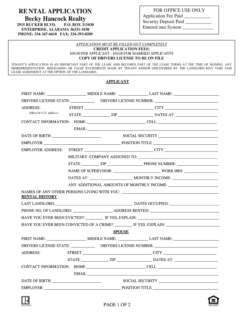 FOR O OFFICE USE ONLY Application Fee Paid Security Deposit Paid Entered into System RE NEAL APPLICATION Becky Hancock Realty 2915 TUCKER BLVD. P.O. BOX 311030 ENTERPRISE, ALABAMA 363311030 PHONE: