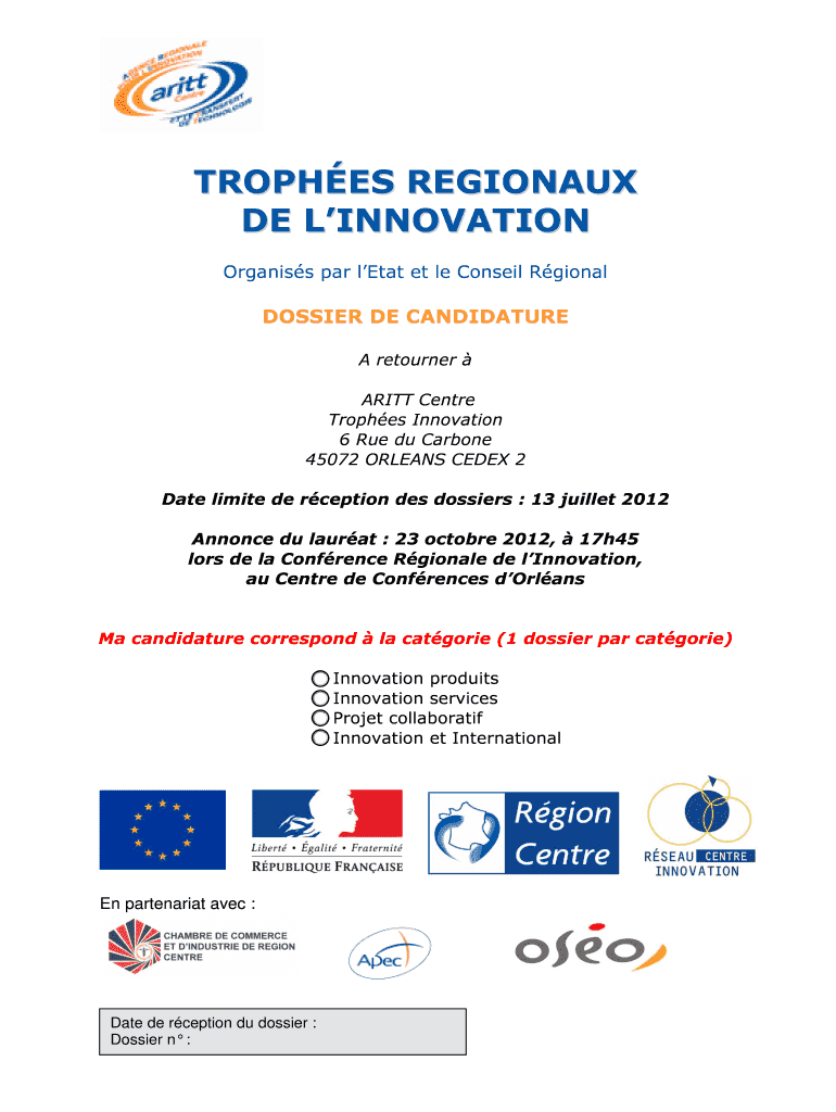 TROPHIES REGION AUX DEL INNOVATION Organism par Leta et LE Conrail Regional DOSSIER DE CANDIDATURE A returner BRITT Center Trophies Innovation 6 Rue du Carbone 45072 ORLEANS CEDEX 2 Date limited DE