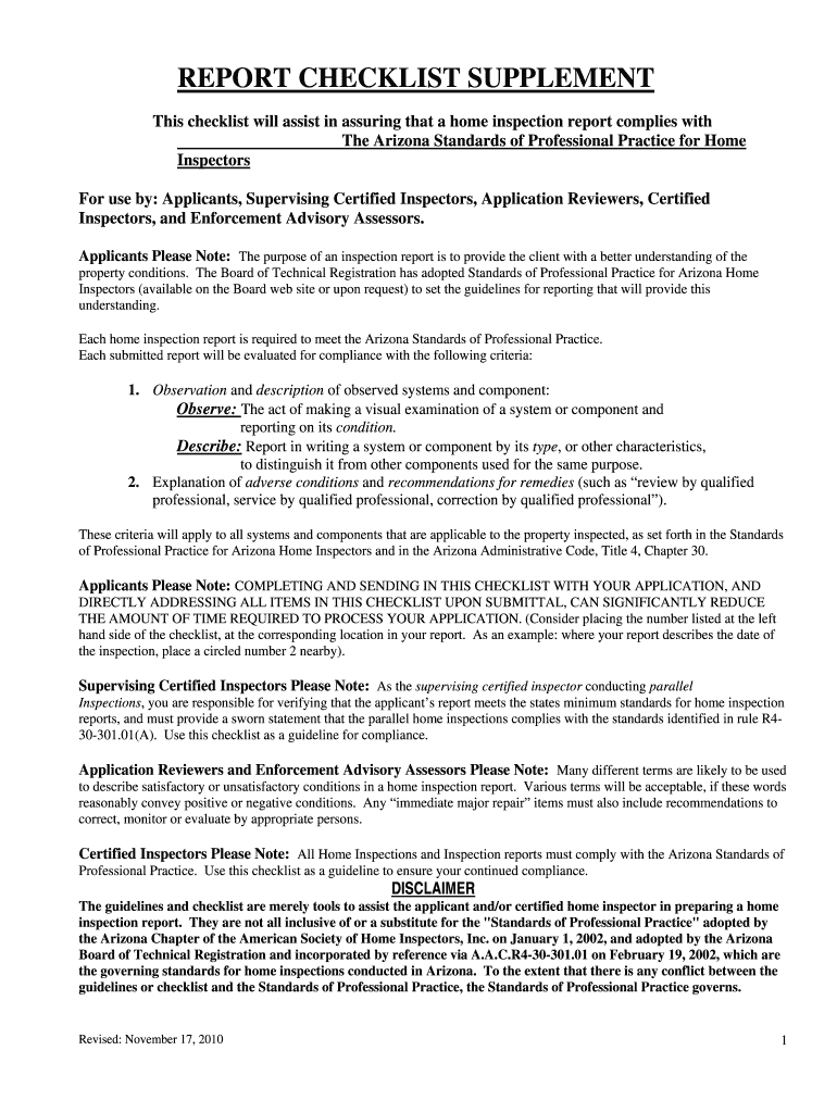 This checklist will assist in assuring that a home inspection report complies with
