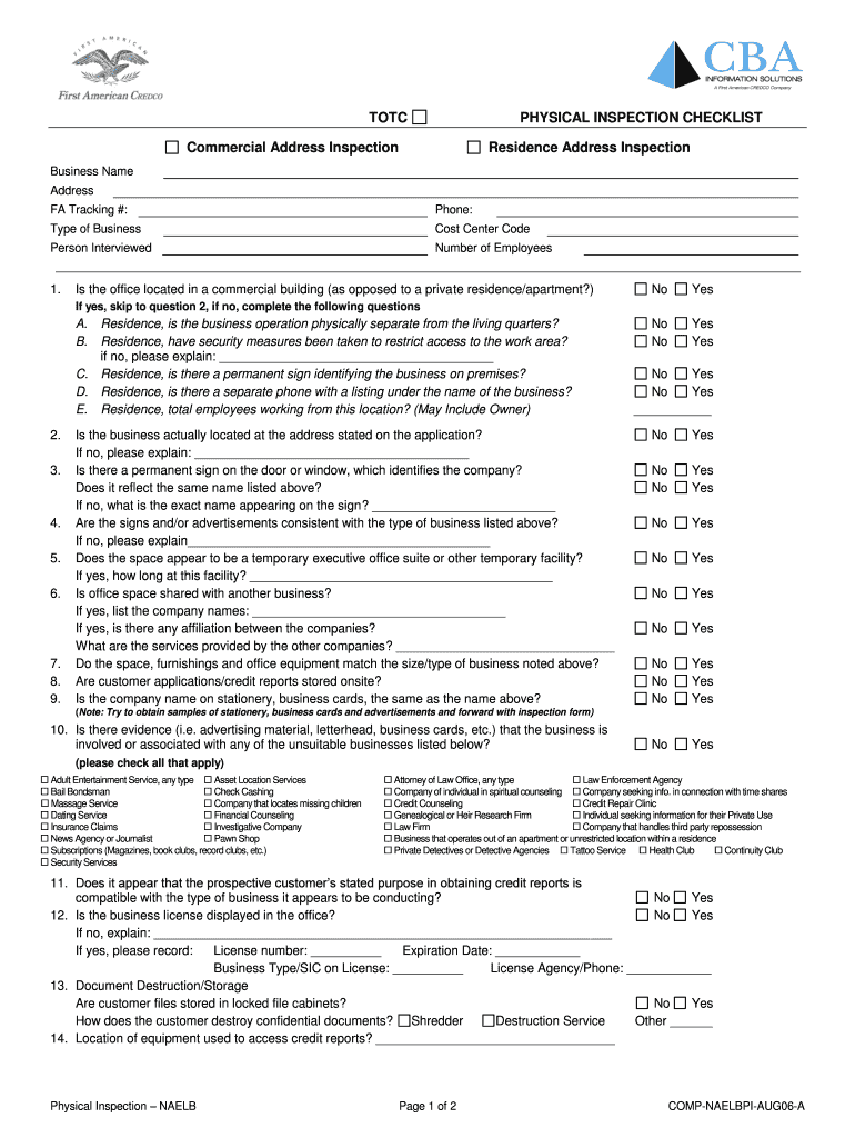 The TOTC Physical Inspection Checklist is a business form used by inspectors and interviewees to verify the physical location and operations of a business.