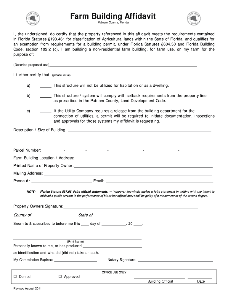 Farm Building Affidavit Putnam County, Florida I, the undersigned, do certify that the property referenced in this affidavit meets the requirements contained in Florida Statutes 193.461 for classification
