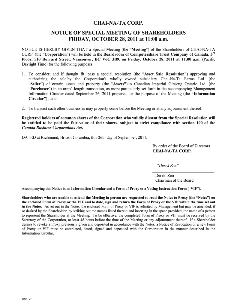 Get the free Notice of Special Meeting of Shareholders and Information 205