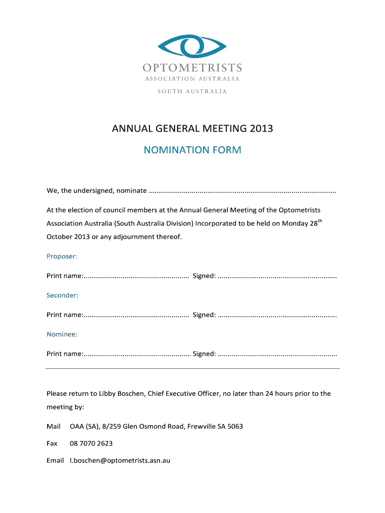 A formal nomination form for council members at the Annual General Meeting of the Optometrists Association Australia (South Australia Division).