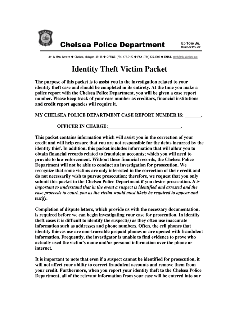 You will need your Chelsea Police Department case report number, personal identification, and potentially additional details from banks and credit bureaus.
