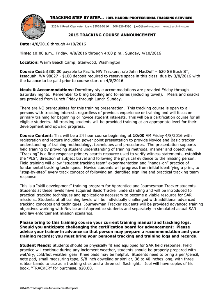 TRACKING STEP BY STEP... JOEL HARDIN PROFESSIONAL TRACKING SERVICES 225 Mill Road, Clearwater, Idaho 835525116 Phone: (360)9667707 Email: 2015 TRACKING Joel jhardininc.com 2089264390 Joel jhardininc.com