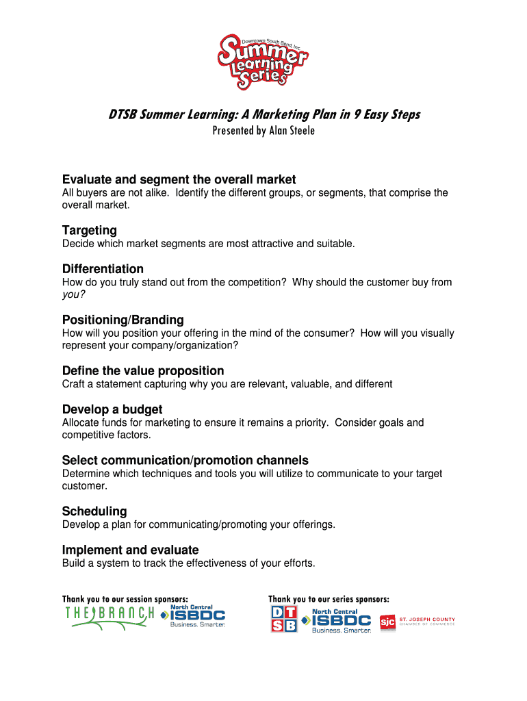 DTS Summer Learning: A Marketing Plan in 9 Easy Steps Presented by Alan Steele Evaluate and segment the overall market All buyers are not alike. Identify the different groups, or segments, that comprise