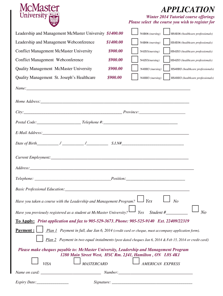 APPLICATION Winter 2014 Tutorial course offerings Please select the course you wish to register for Leadership and Management McMaster University $1400.00 N4B06 (nursing) HS4E06 (healthcare professionals)
