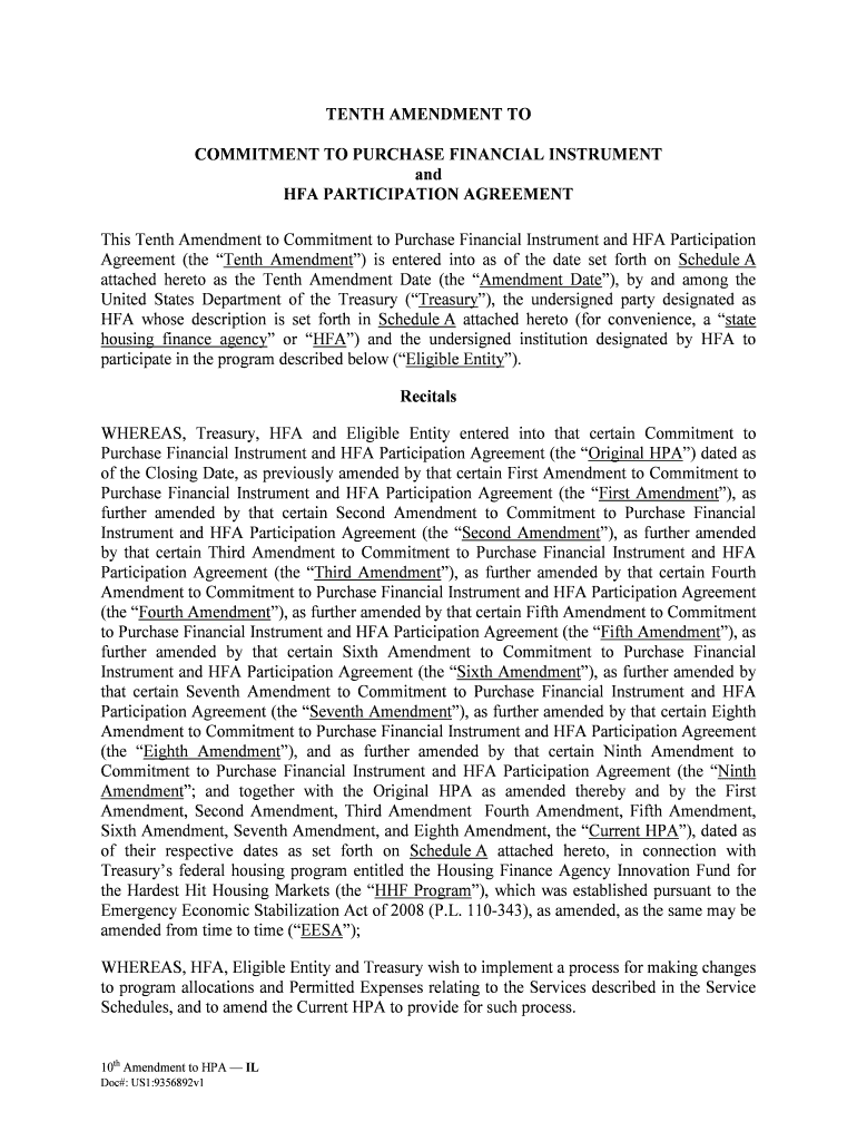 This Tenth Amendment to Commitment to Purchase Financial Instrument and HF Participation