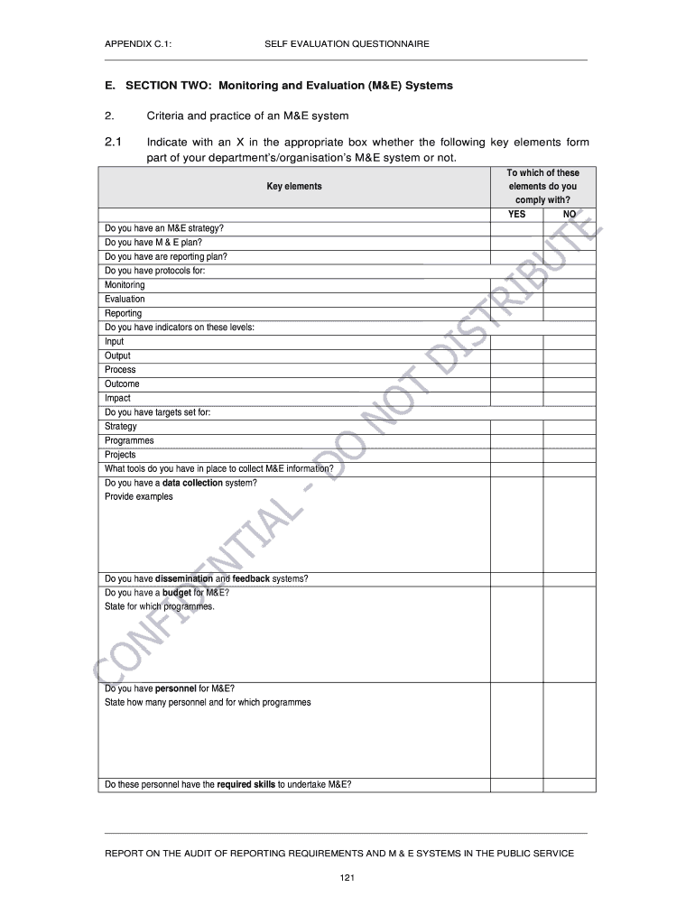 The Self Evaluation Questionnaire for Monitoring and Evaluation Systems is a government form used by departments to assess their M&E strategies and reporting protocols.
