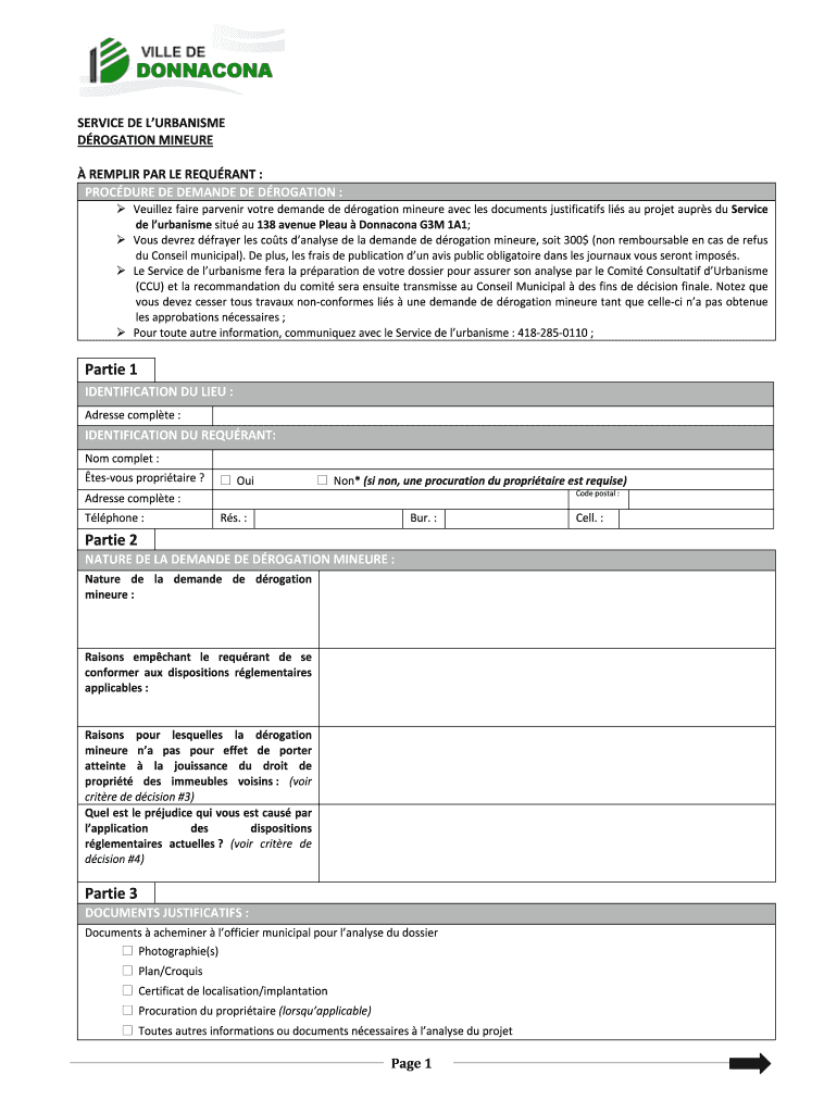 Toute personne ou entité souhaitant obtenir une dérogation mineure conformément aux directives du DC 2012.