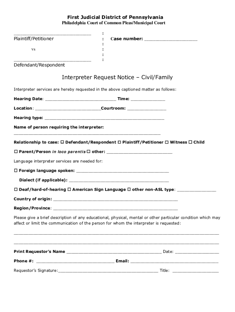 Any party or witness involved in a civil or family court case in Pennsylvania who requires interpreter services due to language barriers or hearing impairments is eligible to submit this form.