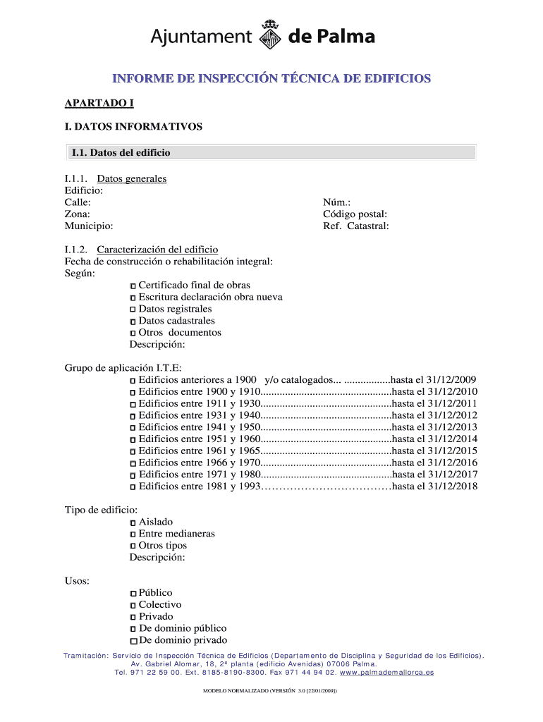 NEXT MODEL ODE INFORMED DE INSPECTION TCN ICA DE EDIFICES (ITE) Tramitacin: Service de Inspeccin Tunica de Edificios (Department de Disciplina y Sciuridae de Los Edifices). Av. Gabriel Palomar, 18,