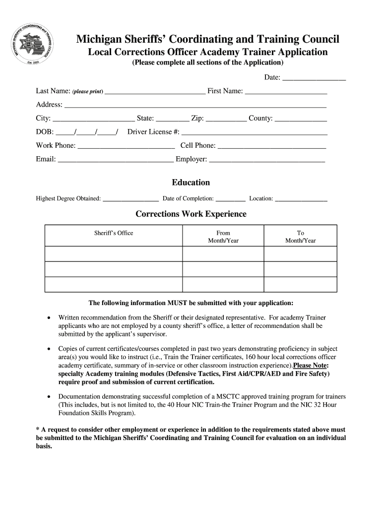 Get the free Academy Trainer Application - Michigan Sheriffs' Coordinating ... - misctc