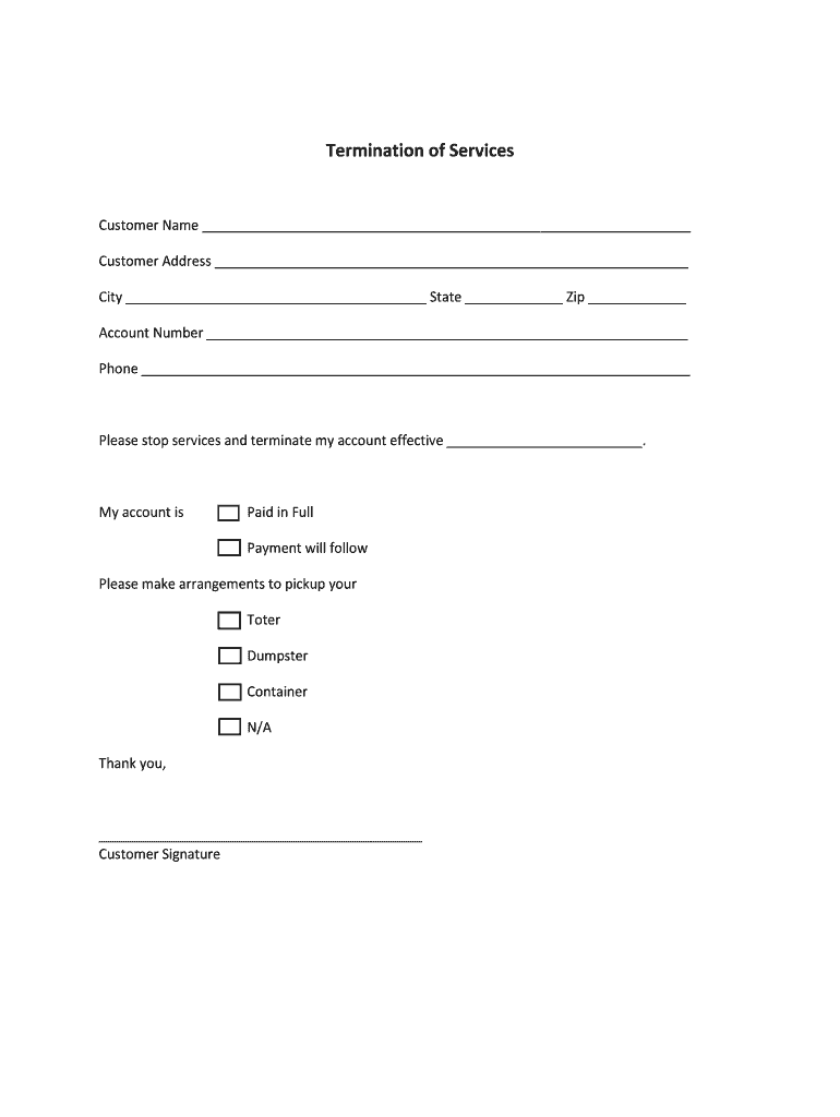 Termination of Services Customer Name Customer Address City State Zip Account Number Phone Please stop services and terminate my account effective. My account is Paid in Full Payment will follow Please