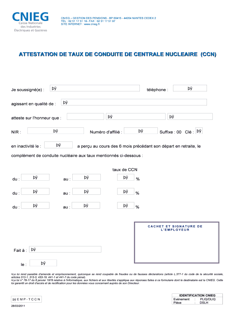 CN IEG SECTION DES PENSIONS BP 60415 44204 NANTES CEDEX 2 TL : 02 51 17 51 18 FAX : 02 51 17 51 97 SITE INTERNET : www.cnieg.fr ATTESTATION DET AUX DE CONDUIT DE CENTRAL NUCLEAR (CCN) JE sous sign(e)