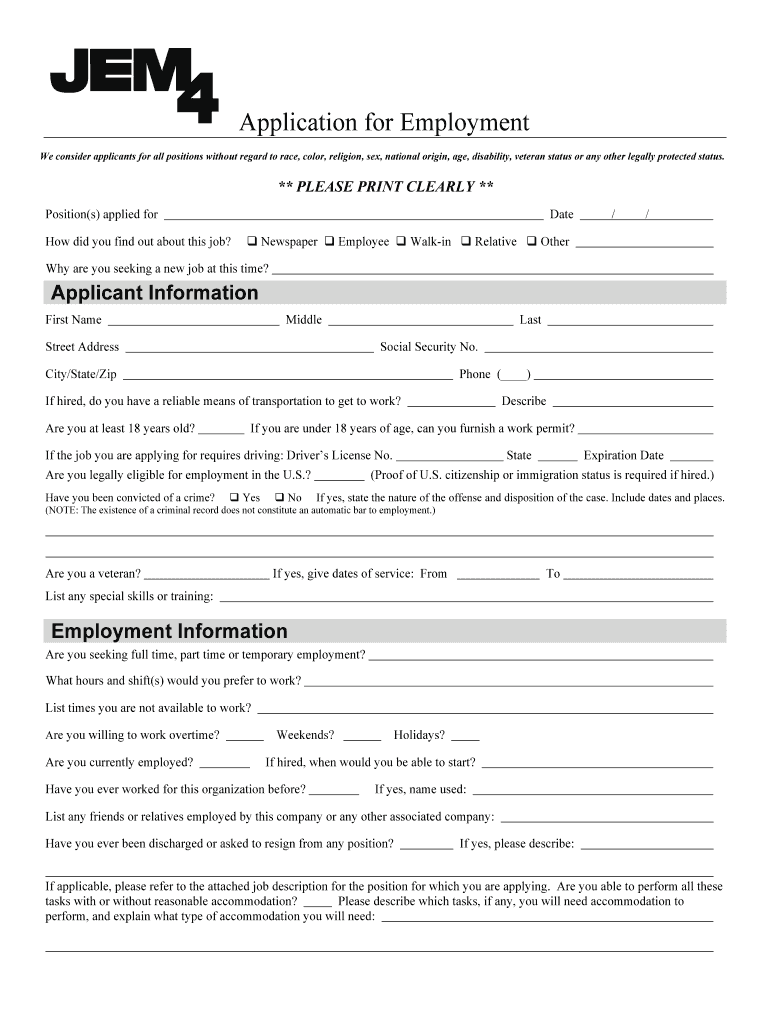 Get the free Application for Employment - 10-6-11 - About JEM4