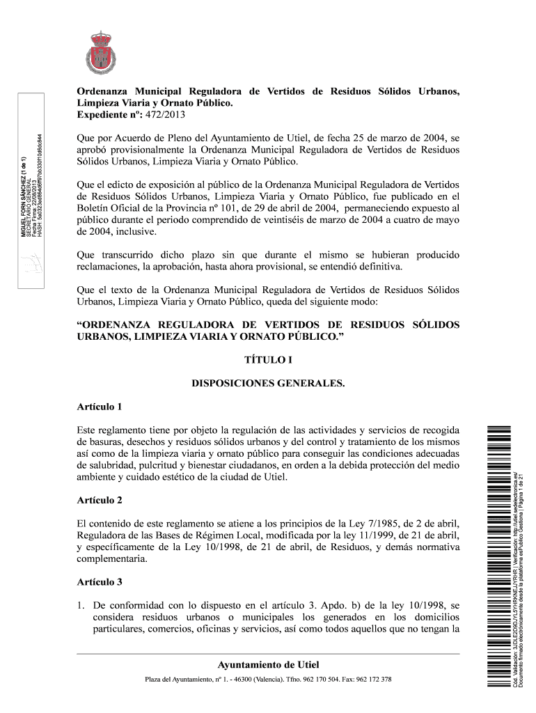 Que POR Acted de Leno Del Ayuntamiento de Utiel, DE tech 25 de Mario de 2004, sea prob provisionalmente la Ordinance Municipal Regulatory DE Vertices de Residuos