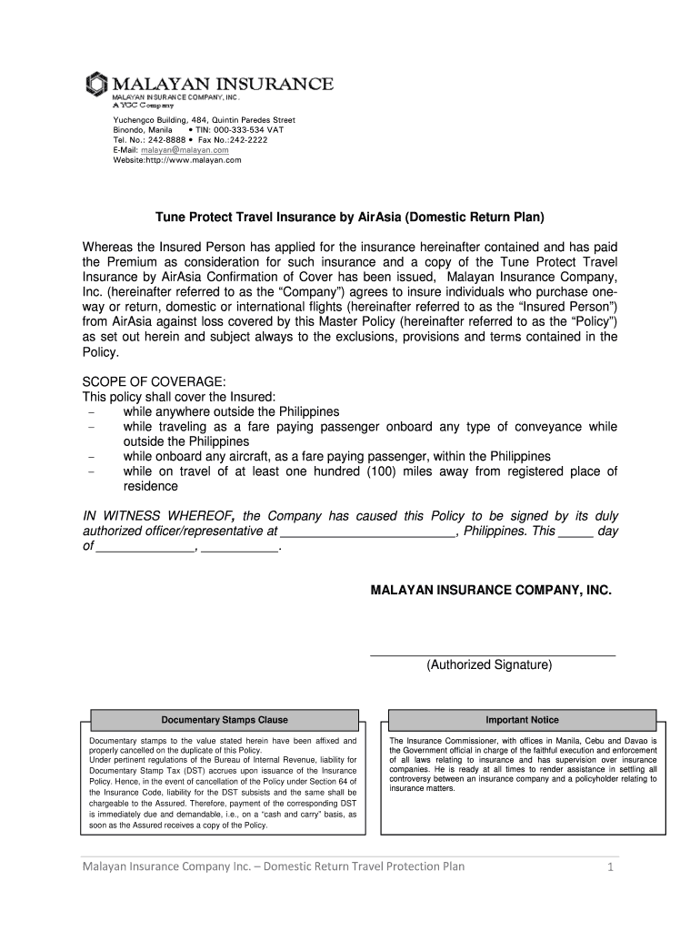 Yuchengco Building, 484, Quentin Parades Street Beyond, Manila TIN: 000333534 VAT Tel. No.: 2428888 Fax No.:2422222 Email: malayan.com Website:http://www.malayan.com Tune Protect Travel Insurance