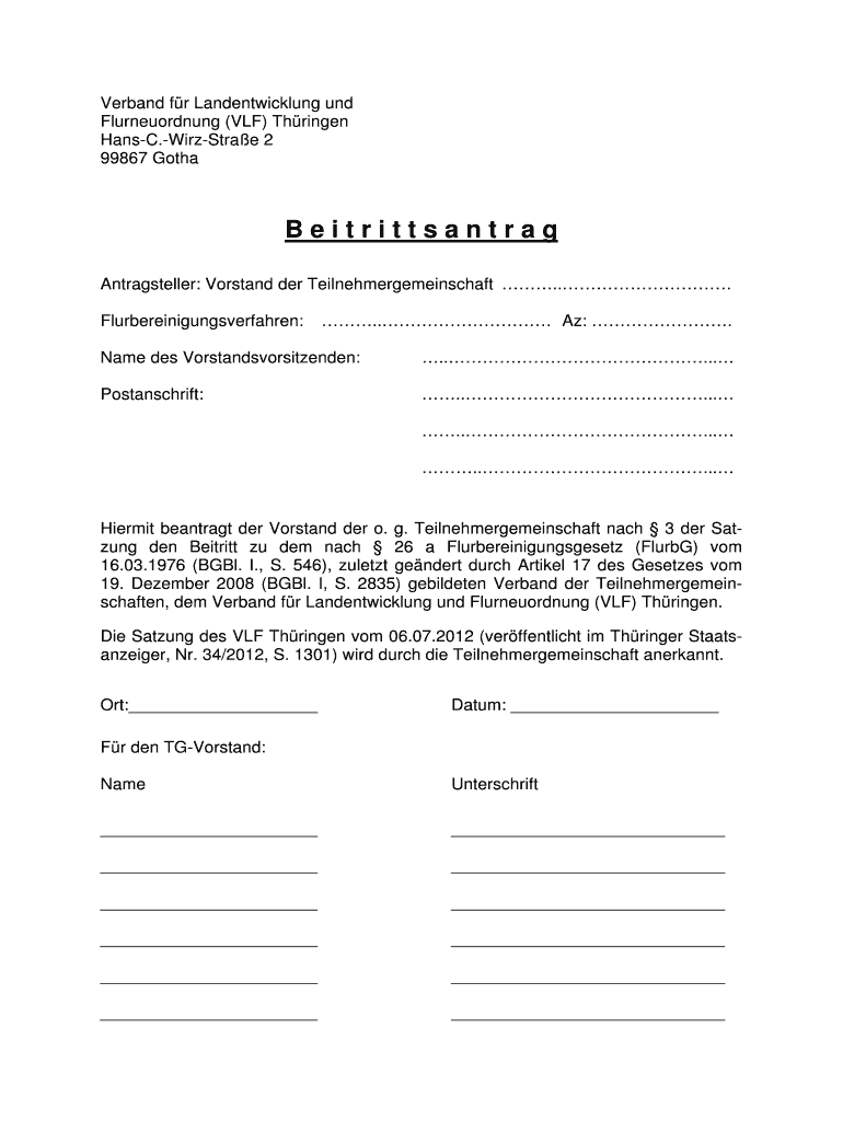 Verb and f r Landentwicklung UND Flurneuordnung (VLF) The ringed Hans-C.-Wirz-Stra e 2 99867 Gotham Beitrittsantrag Antragsteller: Rostand her Teilnehmergemeinschaft. Flurbereinigungsverfahren:. AZ:.