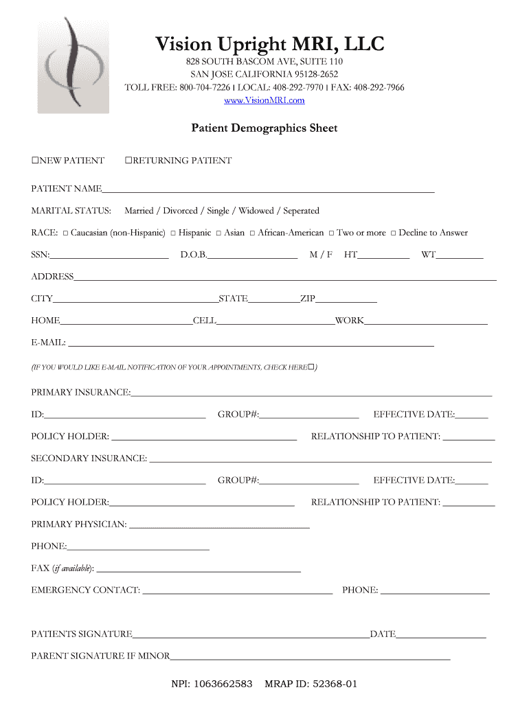 Vision Upright MRI, LLC 828 SOUTH BAS COM AVE, SUITE 110 SAN JOSE CALIFORNIA 951282652 TOLL FREE: 8007047226 LOCAL: 4082927970 FAX: 4082927966 www.VisionMRI.com Patient Demographics Sheet NEW PATIENT
