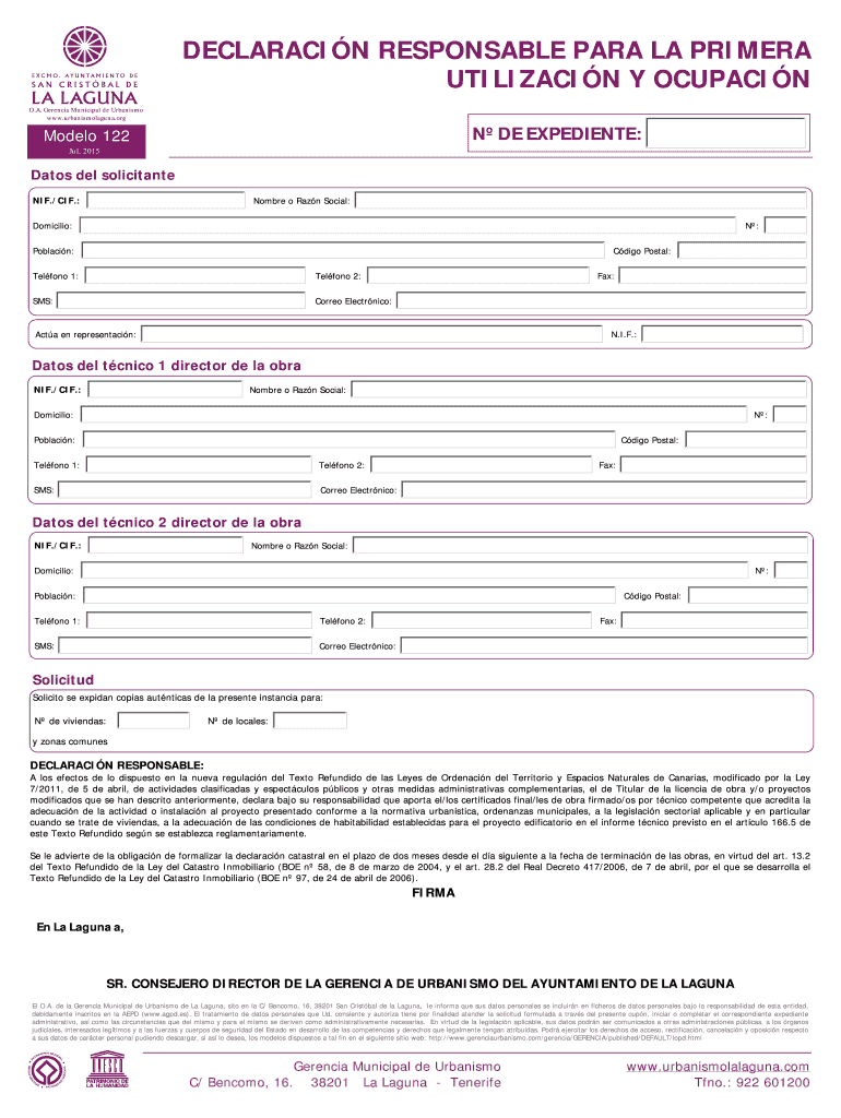 DECLARATION RESPONSIBLE PARA LA PRIMER UTILIZATION Y OCCUPATION O.A. Garcia Municipal de Urbanismo www.urbanismolaguna.org N DE EXPEDIENT: Model 122 Jul. 2015 Dates Del solicit ante NIF./CIF.: Hombre