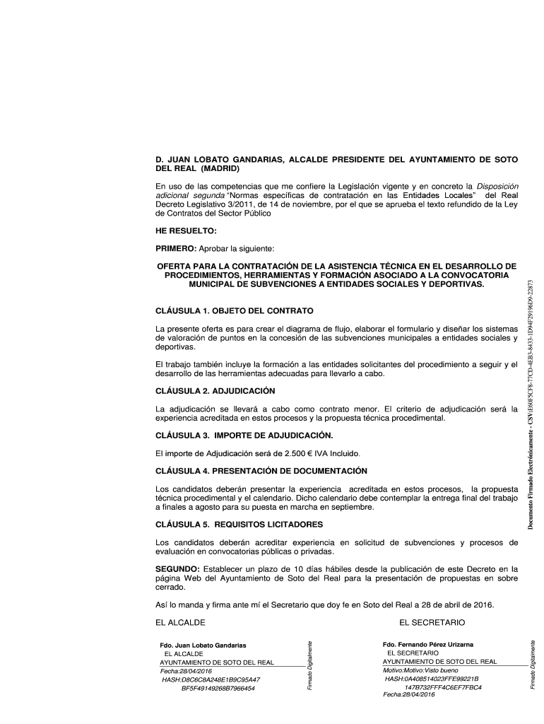 D. JUAN LOB ATO MANDARINS, ARCADE PRESIDENT DEL AYUNTAMIENTO DE SOTO DEL REAL (MADRID) En us ode leis competencies Que me confrère la Legislation Vicente y en concrete la Disposition additional Segundo