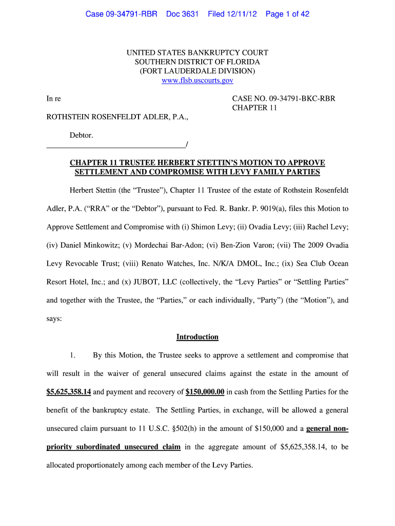 This document is a motion filed by Chapter 11 Trustee Herbert Stettin seeking approval for a settlement agreement with the Levy family parties, which involves a waiver of certain unsecured claims