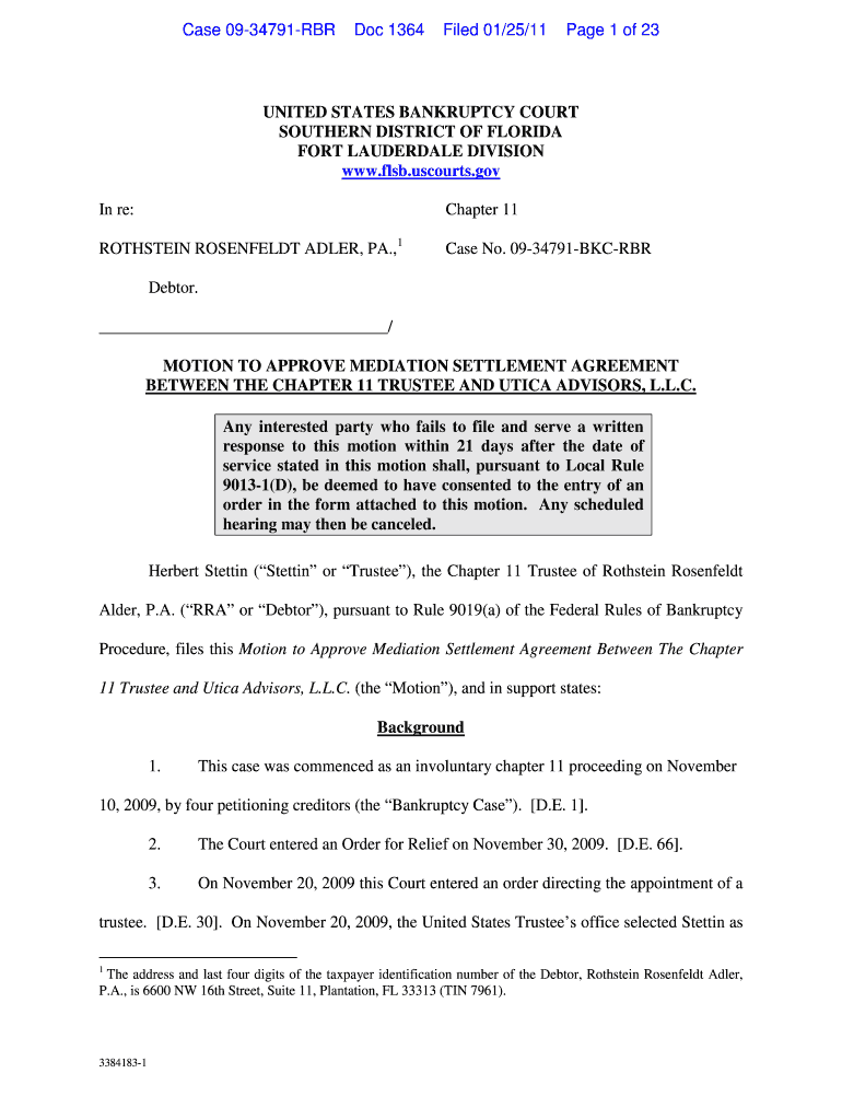 This document is a motion filed by the Chapter 11 Trustee to approve a settlement agreement reached in mediation with Utica Advisors, L.L.C., detailing the terms of the settlement and the background