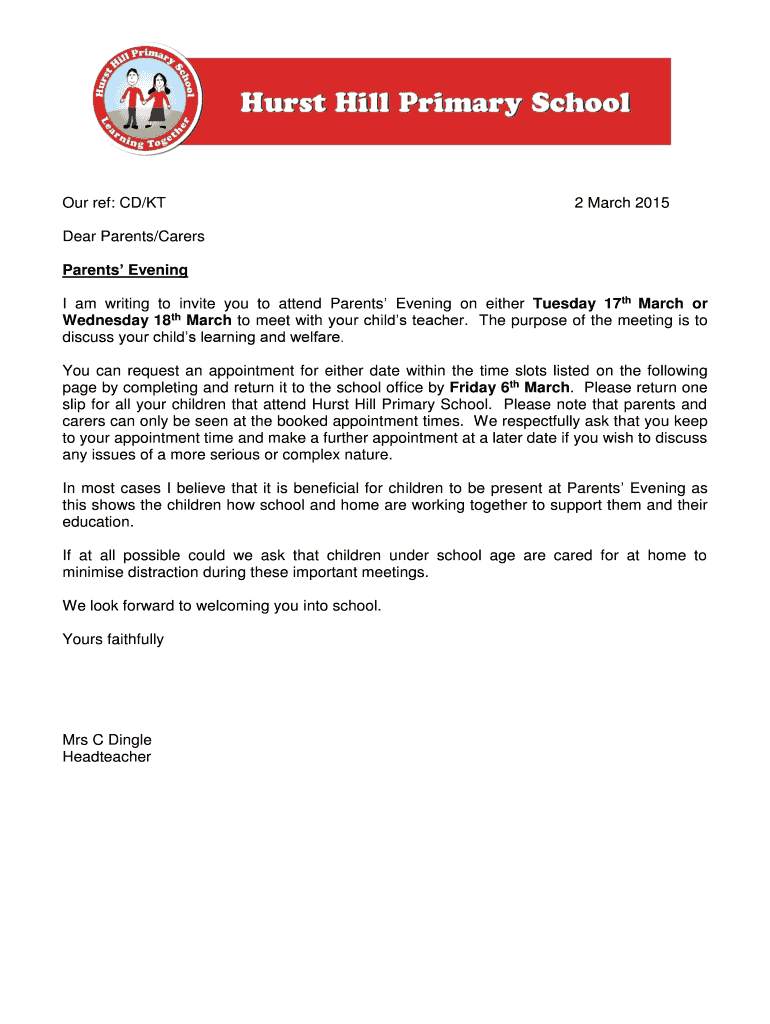 Our ref: CD/KT 2 March 2015 Dear Parents/Carers Parents Evening I am writing to invite you to attend Parents Evening on either Tuesday 17th March or Wednesday 18th March to meet with your children