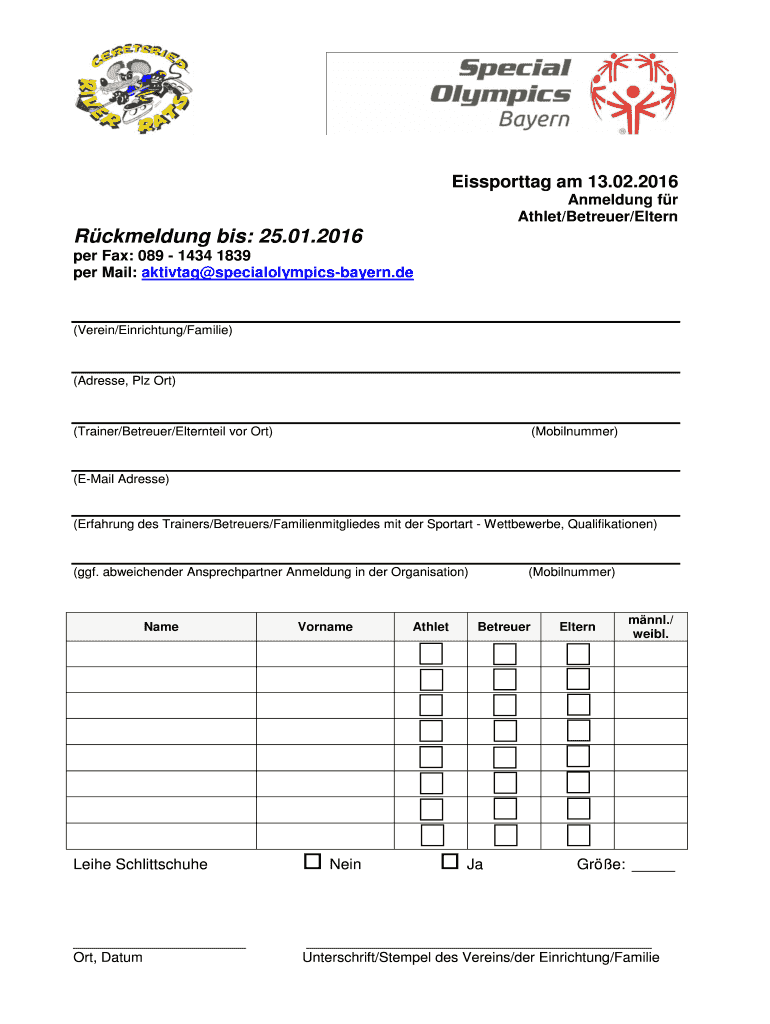 Eissporttag am 13.02.2016 Amending for Athlete/Betrayer/Eastern Rckmeldung bis: 25.01.2016 per Fax: 089 1434 1839 per Mail: activate specialolympicsbayern.DE (Vain/Enriching/Families) (Address, Please