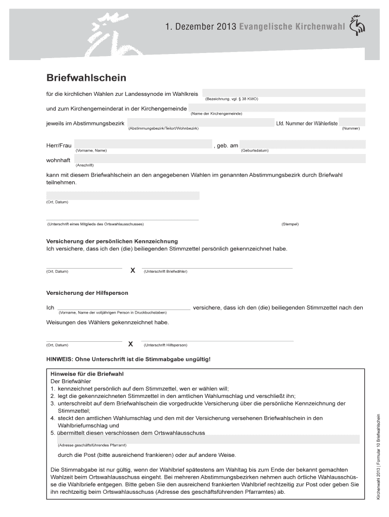 Briefwahlschein for die kirchlichen When our Landessynode I'm Walkers UND sum Kirchengemeinderat in her Kirchengemeinde (Bezeichnung, VGA. 38 TWO) (Name her Kirchengemeinde) Led. Number her Whlerliste