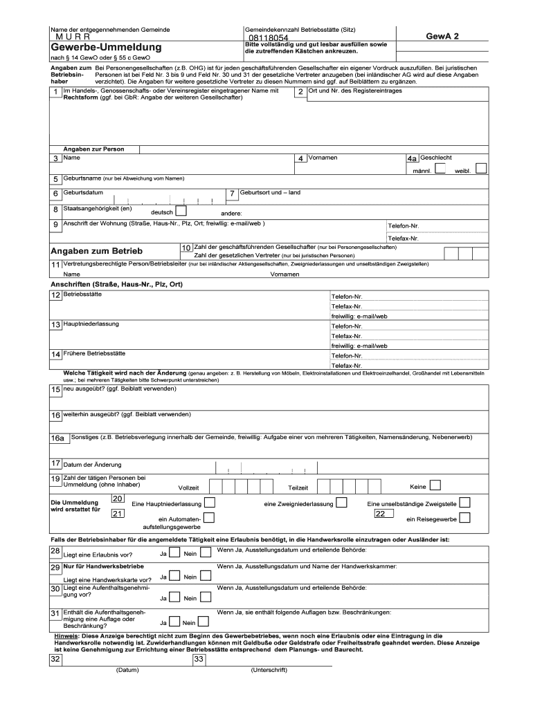 Name her entgegennehmenden Demand Gemeindekennzahl Betriebssttte (Site) BURR Good 2 08118054 Bitter vollstndig UND gut lesser Allen Bowie die zutreffenden Kitchen ankreuzen. GewerbeUmmeldung each