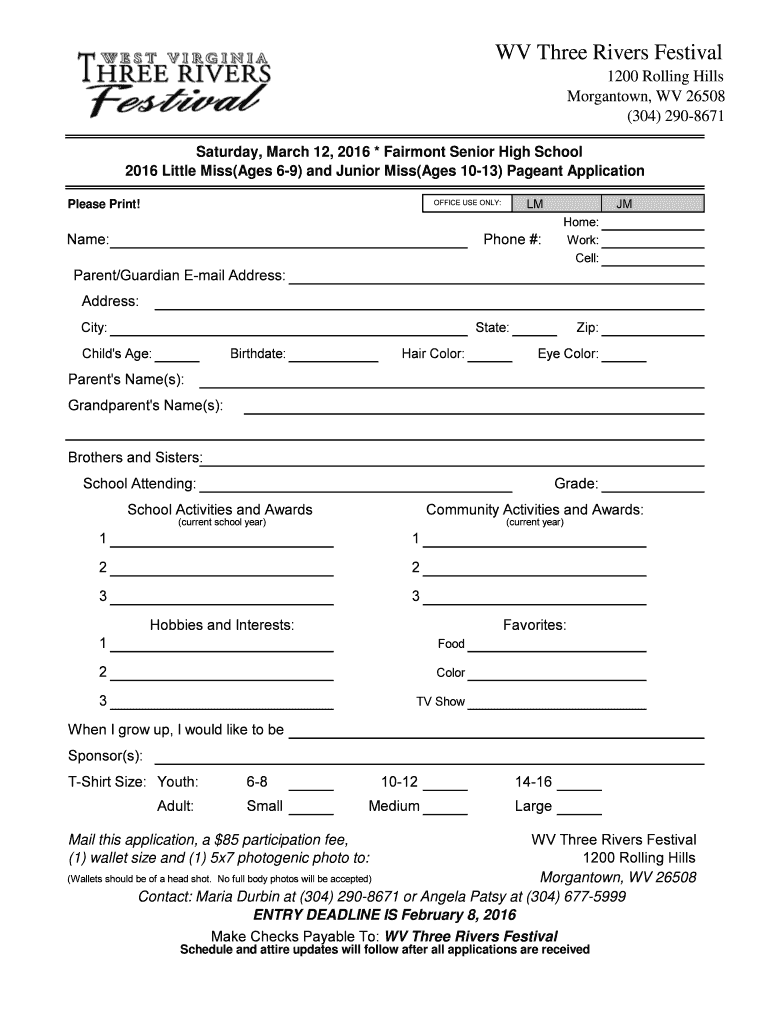 WV Three Rivers Festival 1200 Rolling Hills Morgantown, WV 26508 (304) 2908671 Saturday, March 12, 2016 * Fairmont Senior High School 2016 Little Miss(Ages 69) and Junior Miss(Ages 1013) Pageant Application