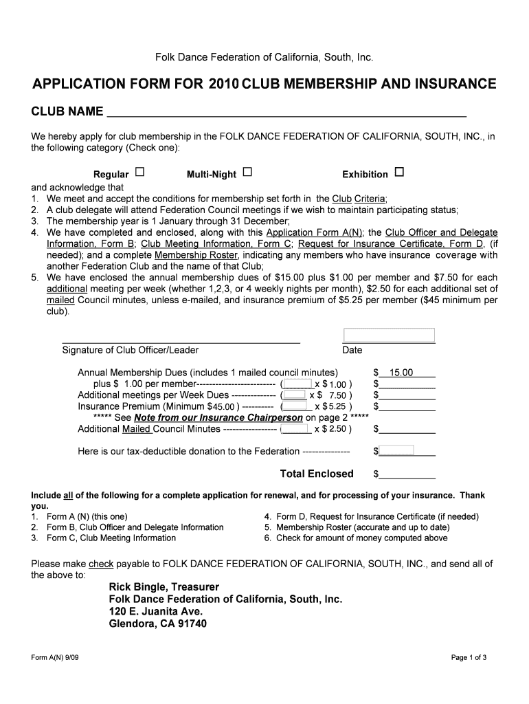 This document is an application form for clubs to apply for membership and insurance with the Folk Dance Federation of California, South, Inc. It outlines the membership categories, dues, requirements