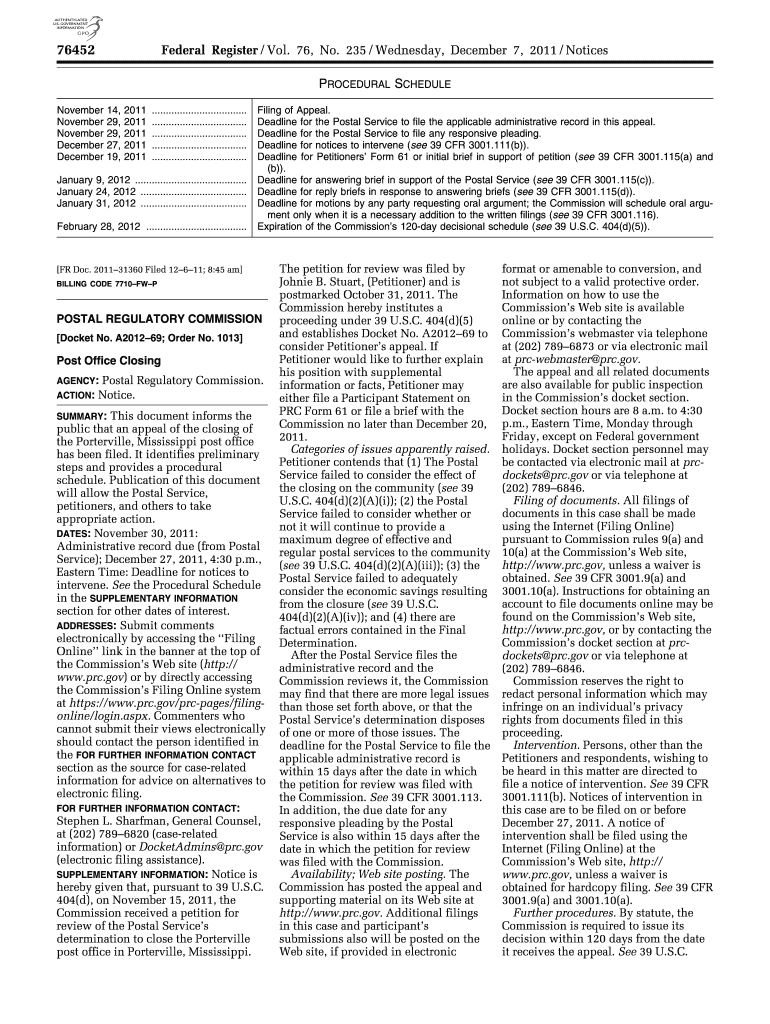 Este documento informa al público que se ha presentado una apelación sobre el cierre de la oficina de correos de Porterville, Mississippi. Identifica pasos preliminares y proporciona un cronograma