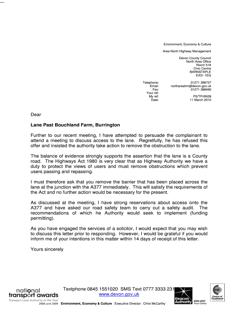 Environment, Economy & Culture Area North Highway Management Devon County Council North Area Office Room 518 Civic Center BARNSTABLE EX31 1EG Telephone: Email: Fax: Your ref: My ref: Date: 01271 388727