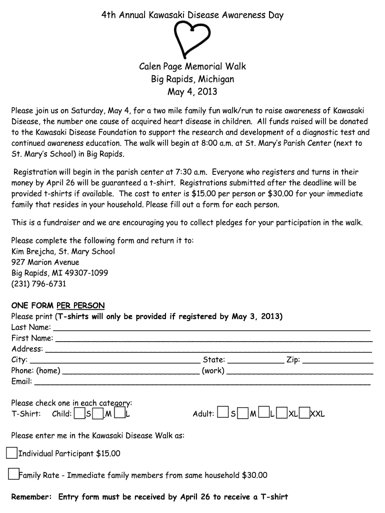 4th Annual Kawasaki Disease Awareness Day Ceylon Page Memorial Walk Big Rapids, Michigan May 4, 2013, Please join us on Saturday, May 4, for a two-mile family fun walk/run to raise awareness of Kawasaki