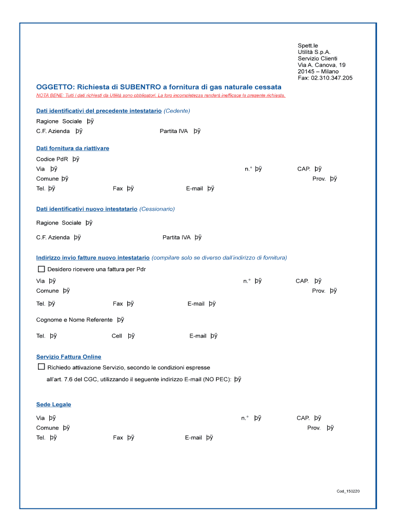Spent.LE Utility S.p.A. Servillo Client Via A. Canola, 19 20145 Milano Fax: 02.310.347.205 GHETTO: Richest DI SENTRY a furniture DI gas natural Cessna NOTA BENE: Tutti i data richest the Utility son