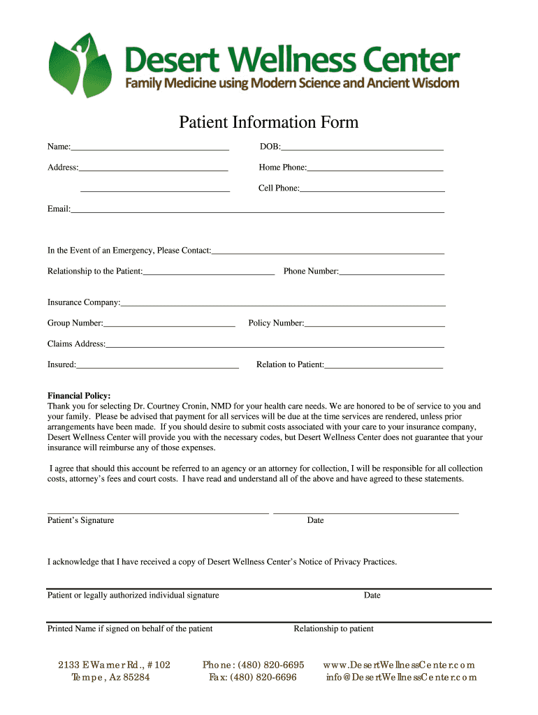 Patient Information Form Name: DOB: Address: Home Phone: Cell Phone: Email: In the Event of an Emergency, Please Contact: Relationship to the Patient: Phone Number: Insurance Company: Group Number: