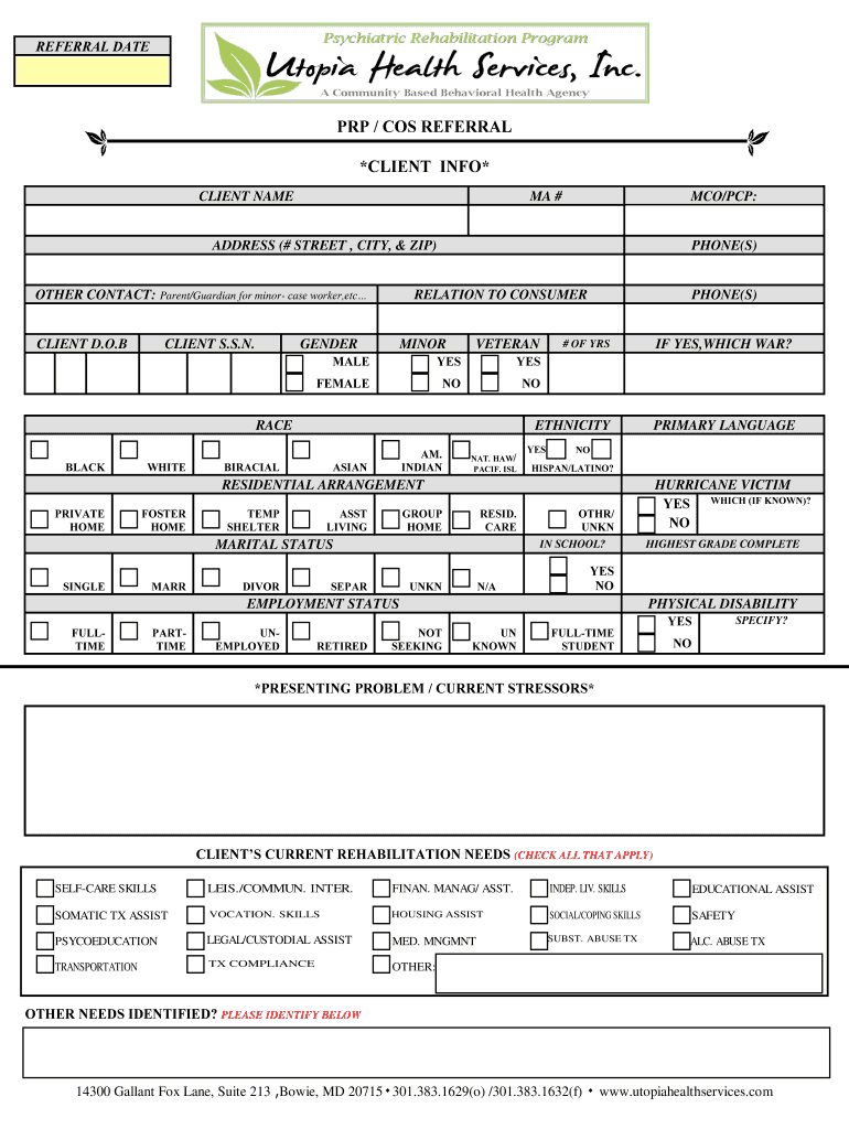 REFERRAL DATE PRP / COS REFERRAL *CLIENT INFO* CLIENT NAME MA # MCO/PCP: ADDRESS (# STREET, CITY, & ZIP) OTHER CONTACT: Parent/Guardian for minor caseworker, etc CLIENT D.O.B CLIENT S.S.N. PHONE(S)