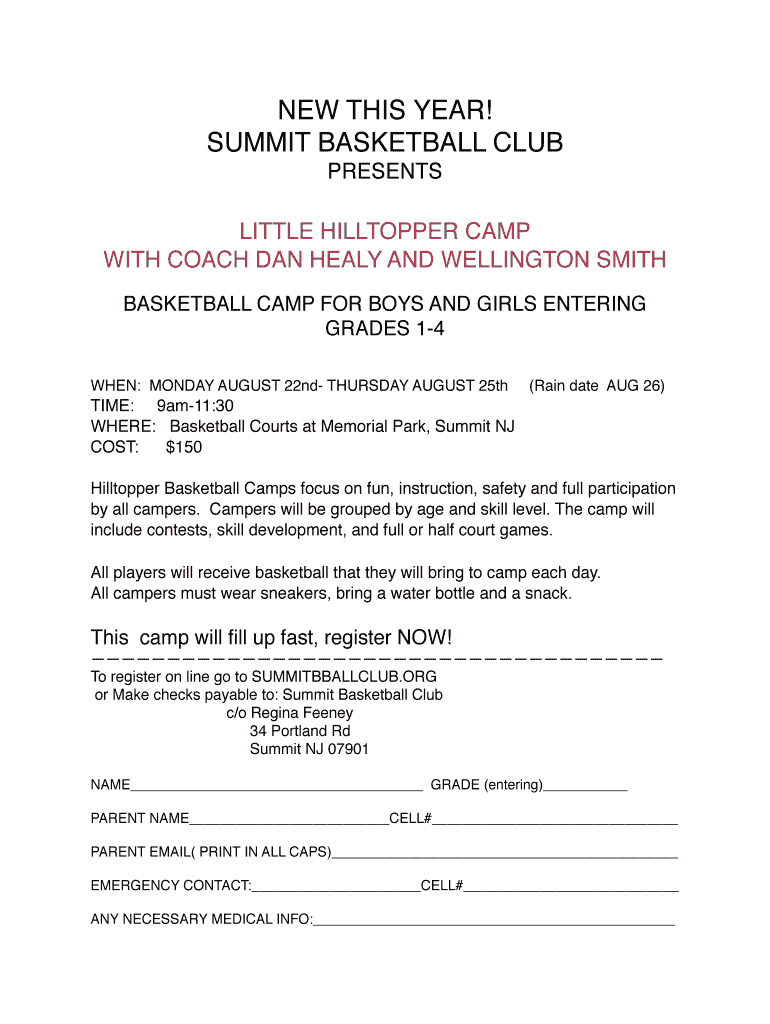NEW THIS YEAR!! SUMMIT BASKETBALL CLUB! PRESENTS! ! ! ! LITTLE HILLTOP PER CAMP! WITH COACH DAN HEAVY AND WELLINGTON SMITH! BASKETBALL CAMP FOR BOYS AND GIRLS ENTERING GRADES 14! ! WHEN: MONDAY, AUGUST
