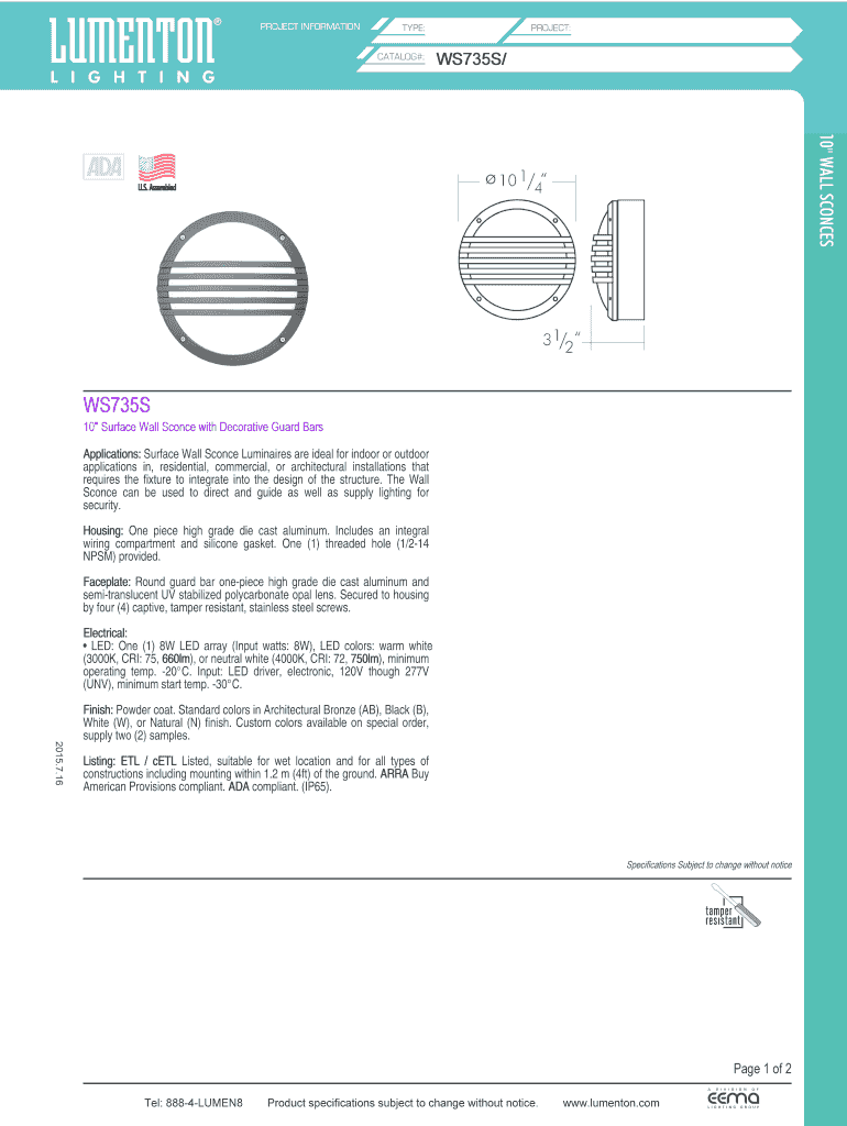 PROJECT INFORMATION PROJECT: TYPE: CATALOG#: WS735S/ 10 WALL SCONCES WS735S 10 Surface Wall Sconce with Decorative Guard Bars Applications: Surface Wall Sconce Luminaires are ideal for indoor or outdoor