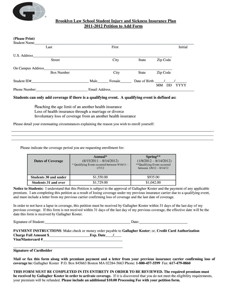 Obtain the Brooklyn Law School Student Injury and Sickness Insurance Plan 2011-2012 Petition to Add Form from the school's website or the student services office.
