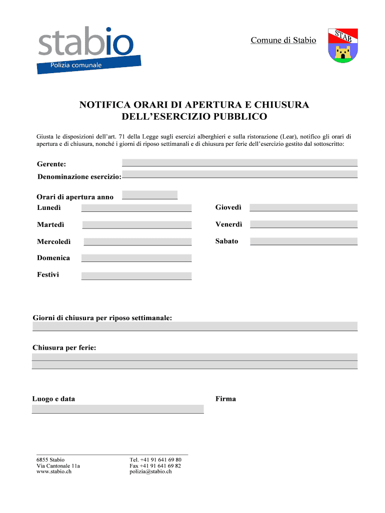 Ottieni il gratuito NOTIFICA ORARI DI APERTURA E CHIUSURA DELLESERCIZIO PUBBLICO - stabio