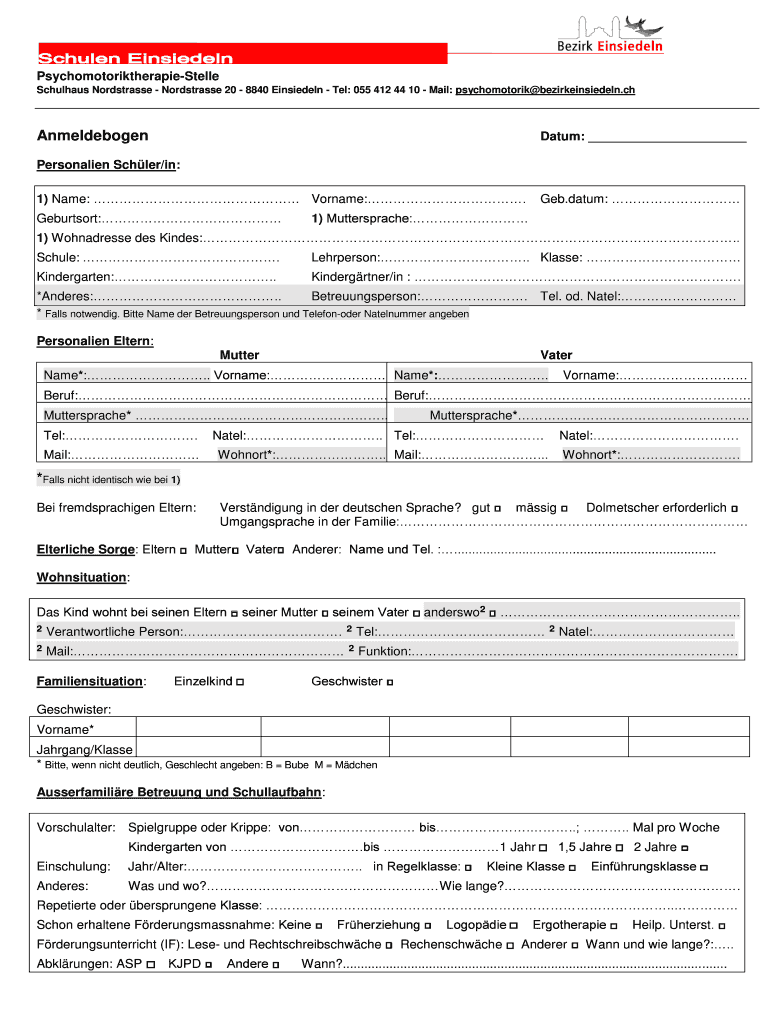 PsychomotoriktherapieStelle Scholars Nordstrasse 20 8840 Einsiedeln Tel: 055 412 44 10 Mail: psychomotor bezirkeinsiedeln.ch Anmeldebogen Datum: Person alien Schlep/in: 1) Name: Surname:. Geburtsort: