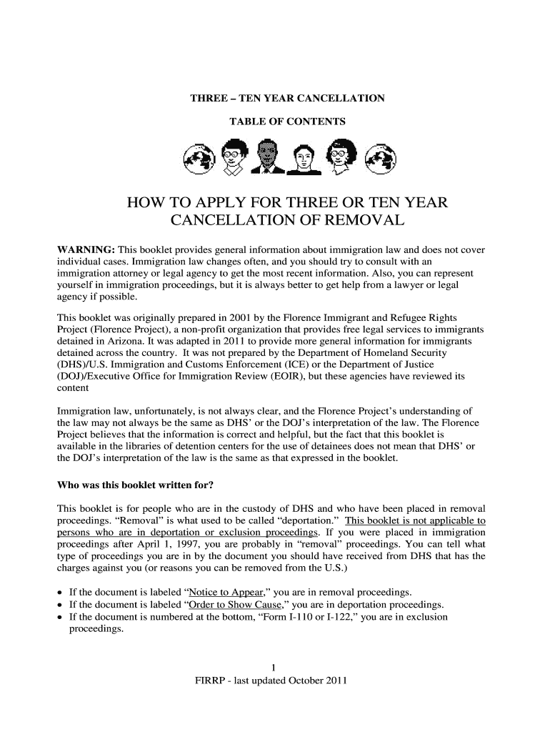 THREE TEN YEAR CANCELLATION TABLE OF CONTENTS HOW TO APPLY FOR THREE OR TEN YEAR CANCELLATION OF REMOVAL WARNING: This booklet provides general information about immigration law and does not cover