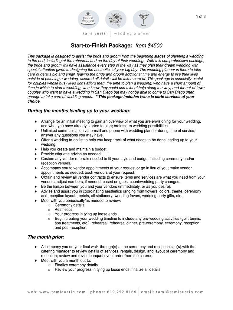 1 of 3 StarttoFinish Package: from $4500 This package is designed to assist the bride and groom from the beginning stages of planning a wedding to the end, including at the rehearsal and on the day